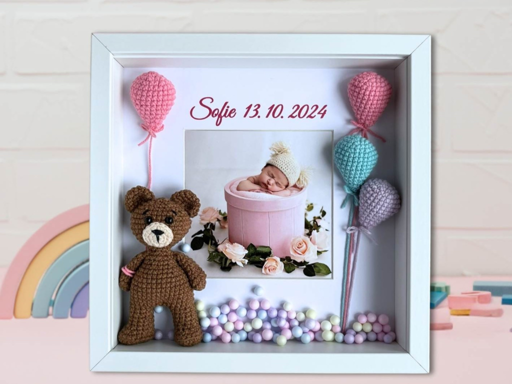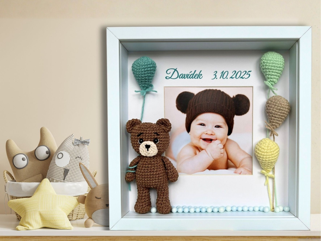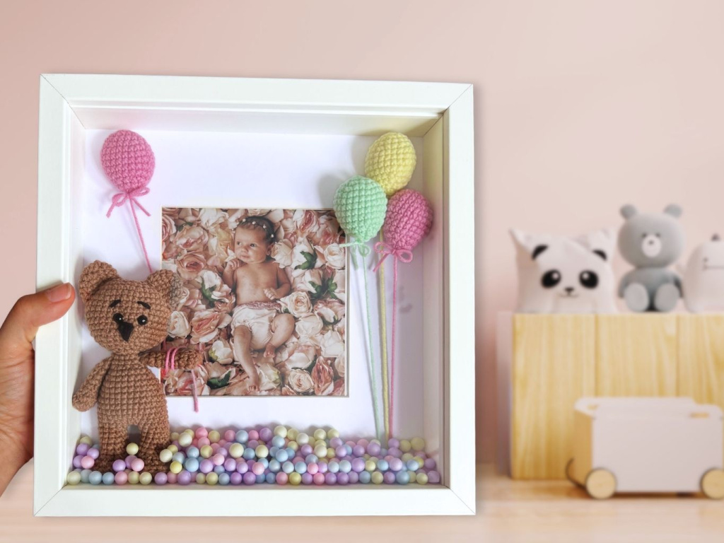Rámeček s fotkou ozdobí každý pokojíček nebo noční stolek. Je jen na vás, jakou fotku dovnitř použijete. Díky ručně háčkovaným dekoracím vynikne 3D efekt. Uvnitř rámečku najdete roztomilého medvídka s balónky.